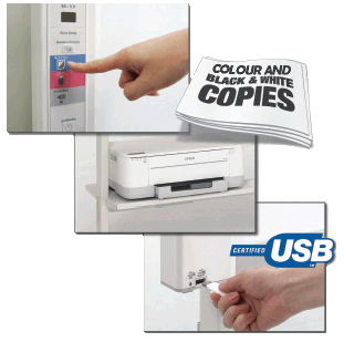 Optional wall mounted printer tray allows for easy storage and access to a compatible installed printer