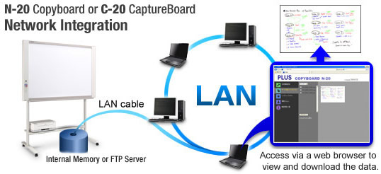 Save your Copyboard data to the board's internal memory. Approximately 100 pages can be stored. Using an assigned IP address, your team can access the images on the board from their computers using a web browser. The data on the board is accessible even in "Stand-by" mode. Password protect the board for added security.