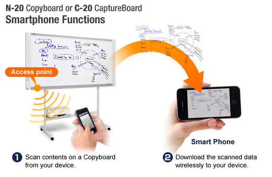 Access Via Your SmartPhone Just install the Meeting Pocket App (MTG pocket) and gain access to many useful and time-saving meeting tools. Both Apple iOS® and Google Android™ mobile operating systems are supported, so you can use your iPhone®, iPad®, iPod® or Android™ phone. The MTG pocket App lets you perform the "scan" function of the board from your SmartPhone. The resulting image file can then be previewed and saved to your phone's memory − as well as to the memory of phones belonging to anyone present in the meeting who has the MTG pocket App installed! Furthermore, the MTG pocket App lets you record audio and video during the meeting. The audio and video files are organised in the same folder as the board image files, so that all of the meeting data is in one convenient location. [Note: Using the MTG pocket App requires the connection of a "wireless access point" to the board as well as a compatible phone. Compatible with Apple iOS 4 and above and Android 2.3 and above.] |